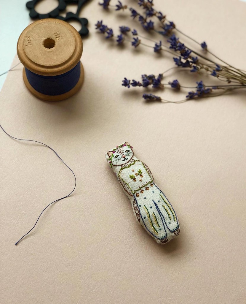 EACH UNIQUE HAND EMBROIDERED CHARACTER IS LOVINGLY STUFFED WITH ORGANICALLY GROWN LAVENDER, HANDPICKED FROM MY MOTHER’S GARDEN IN CORNWALL. USUALLY MEASURING BETWEEN FIVE AND TEN CENTIMETERS, FITTING SNUGGLY IN THE HAND.