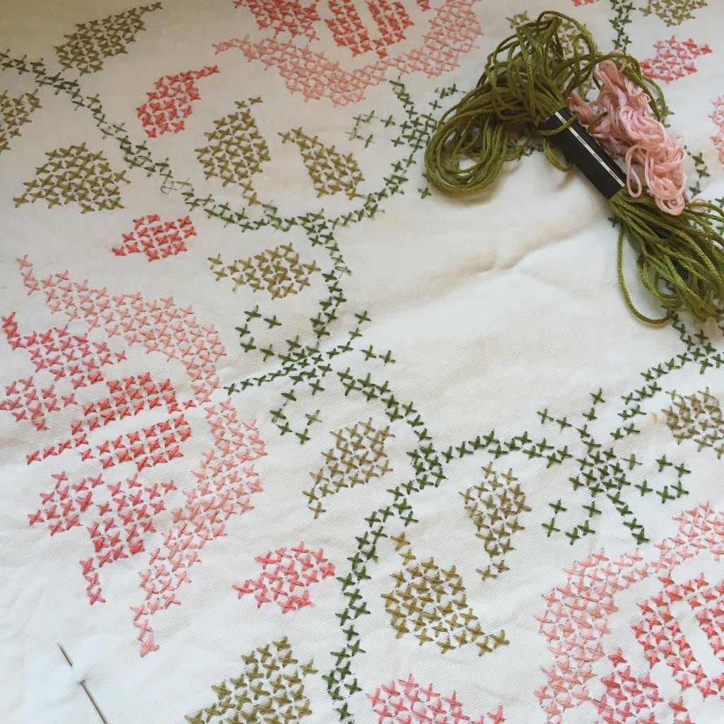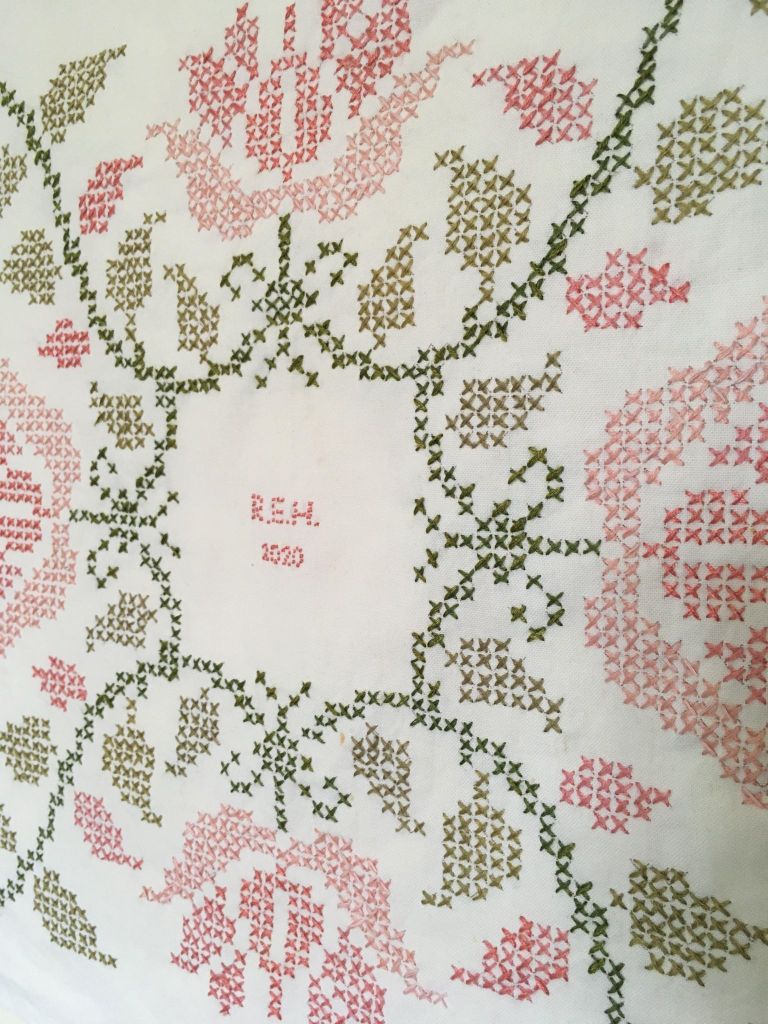 THIS BEAUTIFUL CUSHION WAS FOUND IN AN ANTIQUE SHOP IN CORNWALL. THE STITCHING WAS INCOMPLETE AND SOME OF THE AREAS THAT HAD BEEN DONE WERE DELICATE AND UNRAVELLING. I SPENT TIME REPAIRING AND COMPLETING THE STITCH WORK, ADDING THE DATE AND MY OWN INITIALS TO THE CENTER, LIKE AN OLD VICTORIAN SAMPLER. A JOINT PROJECT WITH THE UNKNOWN STITCHER THAT CAME BEFORE ME.