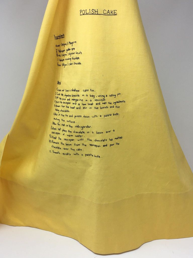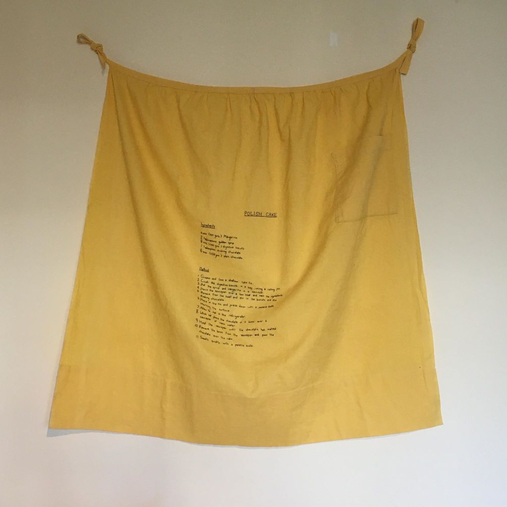 ‘POLISH CAKE’ IS A RECIPE FROM MY MOTHER’S OLD SCHOOL COOKERY BOOK – WHICH IS GRADUALLY FALLING APART AFTER YEARS OF LOVE AND USE. THIS IS A RECIPIE MY FAMILY KNOWS VERY WELL, IT BRINGS BACK MEMORIES OF CHILDHOOD AND AN EXCITABLE BUT METHODICAL TIME IN THE KITCHEN. I HAVE PRESEVED THE ORIGINAL WORDS OF THE RECIPIE IN STITCH, ON THIS BEAUTIFUL YELLOW APRON, FROM AN ANTIQUE MARKET IN THE SOUTH OF FRANCE.